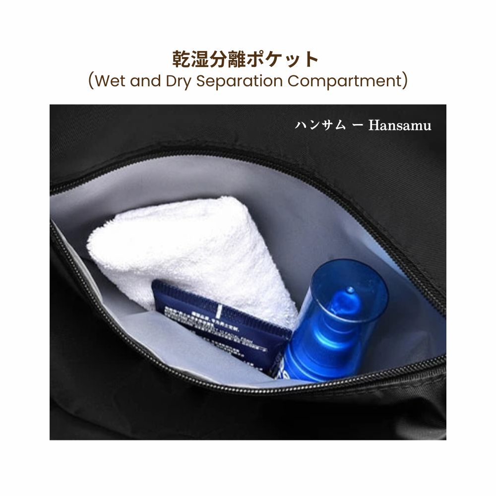 - 乾湿分離ポケット (Separate wet and dry compartment)