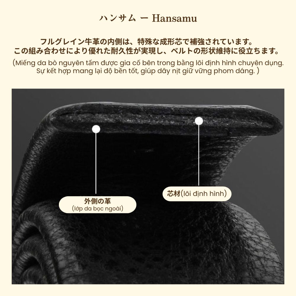 Hansamu Rin mang tinh thần của người đàn ông luôn biết mình muốn gì: chỉn chu, mạnh mẽ và đầy tự tin. Chiếc thắt lưng được tạo ra không chỉ để hoàn thiện phong cách mà còn để nâng tầm đẳng cấp - một biểu tượng của sự trưởng thành và sức hấp dẫn đầy nội lực.