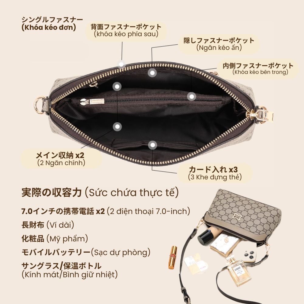 Chiếc túi Kirei Hina là sự giao thoa hoàn hảo giữa truyền thống và hiện đại. Họa tiết cổ điển được khắc họa tinh xảo, như một lời thì thầm về khí chất nghệ thuật riêng biệt của người phụ nữ hiện đại. Với thiết kế đa năng, dây đeo tháo rời linh hoạt, chiếc túi nhỏ gọn này hoàn toàn đáp ứng nhu cầu sử dụng hàng ngày của các chị em, từ xách tay thanh lịch, đeo vai thường ngày, đến đeo chéo năng động.