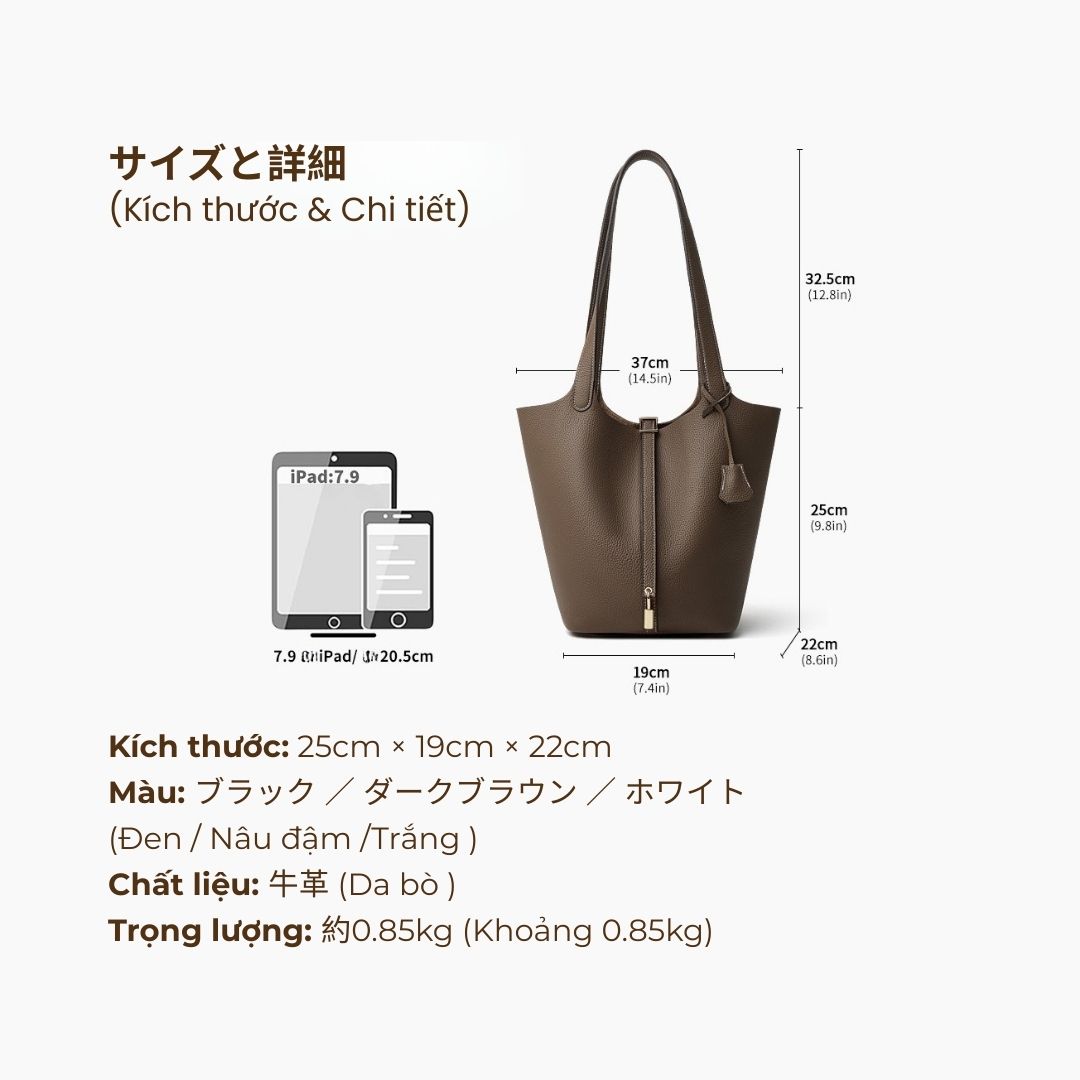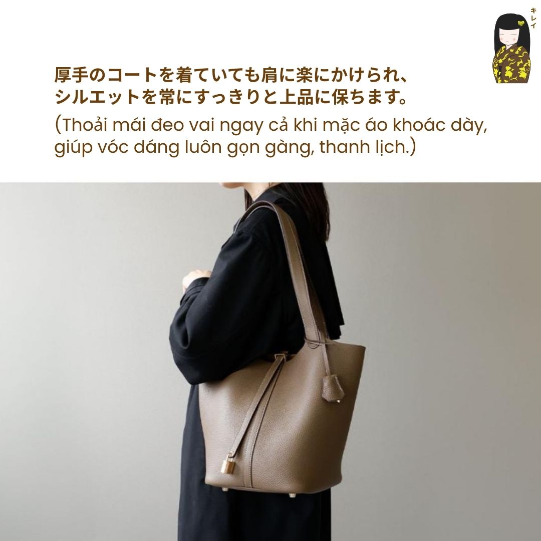 Chiếc túi tote Kirei Yugen được làm từ da bò hai lớp cao cấp, mềm mại mà vẫn giữ dáng vững vàng. Từng đường may tinh tế, form túi tối giản nhưng sang trọng, tạo nên vẻ thanh lịch tự nhiên trong từng chuyển động của người phụ nữ.